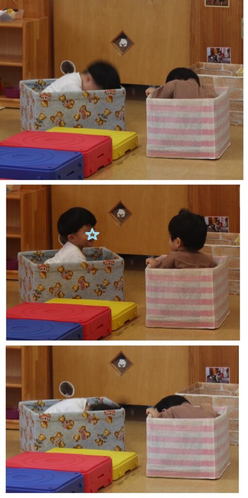 こんな風に、隣同士で遊ぶだけではなくて、何となく同じもので一緒に遊んでいるような…という姿も。