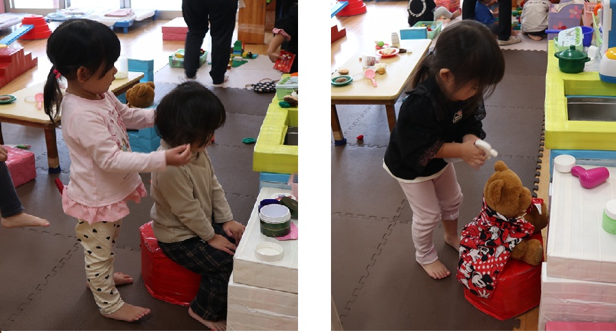 育児の場面ではしっかりと教えたり、関わったりし、あそびの場面では程よい距離感で声をかけたり援助しては離れる・・・をクラス中(!!)の子ども達に対して行えると、こんな風に、楽しいあそびがあちこちで見られるようになりますよ♪