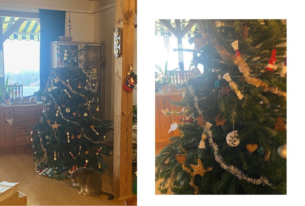 とにかく、年々少しずつ増えていく飾り(買って増えるというよりは、細々ともらったものが増えていくので統一感、おしゃれ感はゼロ)をとりあえずはまんべんなくぶら下げる!を目標に飾られるツリー。